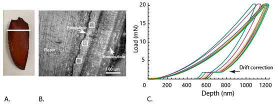 - Müller, M.; Olek, M.; Giersig, M.; Schmitz, H. Micromechanical properties of consecutive layers in specialized insect cuticle: The gula of Pachnoda marginata (Coleoptera, Scarabaeidae) and the infrared sensilla of Melanophila acuminata (Coleoptera, Buprestidae). J. Exp. Biol. 2008, 211, 2576–2583. [Google Scholar] [CrossRef]