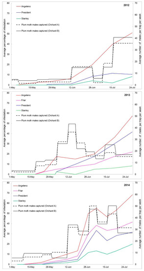 Infestation trend recorded on the four plum cultivars in the three years 2012–2014, and the mean number of Plum Fruit Moth males caught in pheromone traps placed in the two plum orchards.