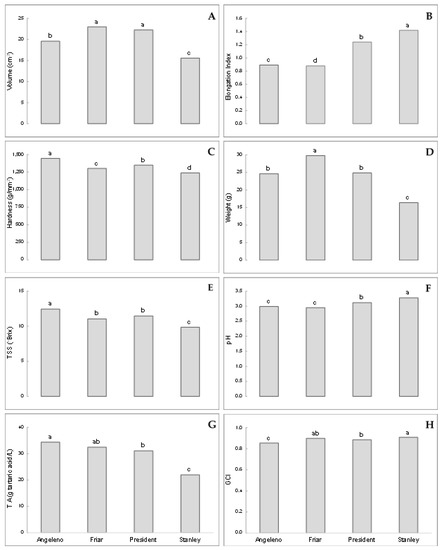 Average values of the variables for which significant differences among the cultivars occurred (different letters indicate significant differences among the four cultivars, general linear model (GLM) followed by Tukey’s HSD test, p < 0.001). Volume (A), elongation index (B), hardness (C), and weight (D) were analysed using the Data Set 1, whereas Data Set 2 was used for total soluble solid (TSS) (E), pH (F), titratable acidity (TA) (G), and ground colour index (GCI) (H).