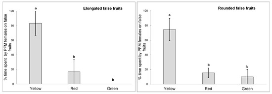 PFM females spent a significantly greater percentage of the time on yellow false fruits in the trials 1 and 2, in which only rounded or elongated false fruits were used, respectively. The insect spent 83% of time on yellow elongated false fruits (trial 1) and 75% on yellow rounded false fruits (trial 2). In both trials, percentage of time spent on red and green false fruits were not significantly different (1-way ANOVA: trial 1, elongated fruits: F(2,9) = 10.50, p = 0.004; trial 2, rounded fruits: F(2,12) = 10.21, p = 0.003, Figure 3).