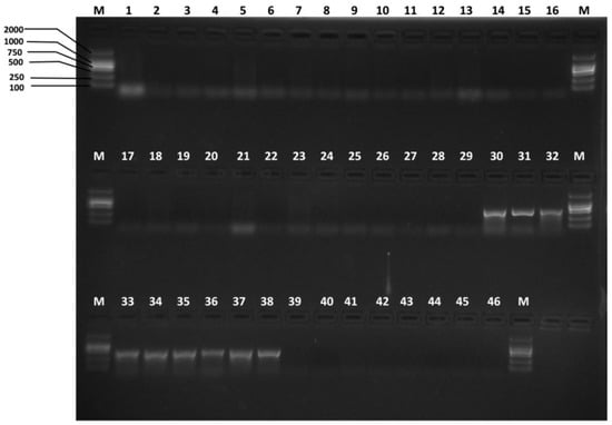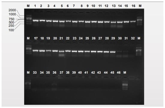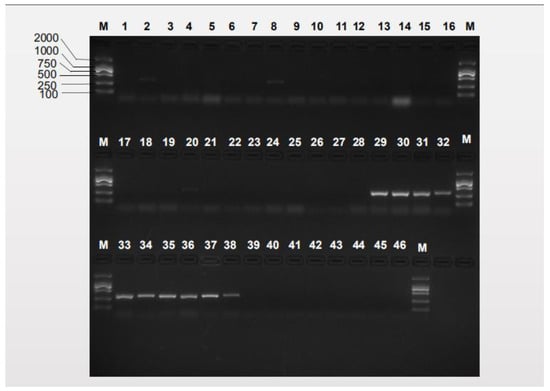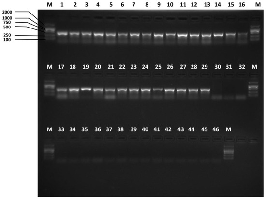 Specificity of the Bm-F/Bm-R B. minax-specific primer pair. Lanes 1–29: B. minax from 29 geographical populations (Table S3); lanes 30–38: B. tsuneonis from nine geographical populations (Table S3); lane 39: B. correcta, lane 40: B. dorsalis; lane 41: B. latifrons; lane 42: B. tryoni; lane 43: B. zonata; lane 44: Zeugodacus cucurbitae; lane 45: Z. scutellatus; lane 46: Z. tau; lane M: D2000.