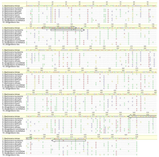 Alignment of COI sequences of 10 species of quarantined fruit flies in China. The sequences indicated by the arrows are the sites of the B. minax and B. tsuneonis-specific primers in the DNA barcode sequences of the target species. The arrow is in the 5’-3’ direction.