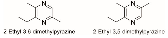 - Joo, K.; Ho, C.-T. Quantitative analysis of alkylpyrazines in regular- and low-fat commercial peanut butter preparations. Biosci. Biotechnol. Biochem. 1997, 61, 171–173. [Google Scholar] [CrossRef] [PubMed]