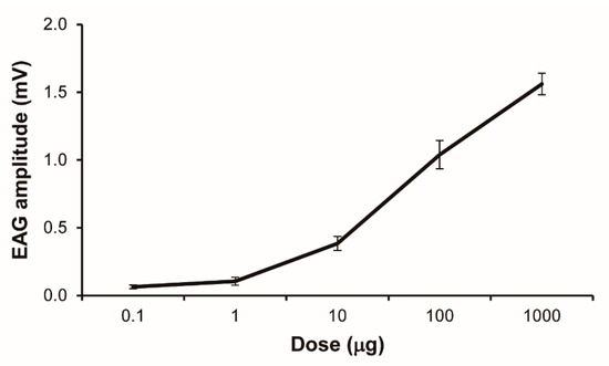 An electroantennogram (EAG) dose–response curve for Solenopsis invicta workers responding to 2-ethyl-3,5-dimethylpyrazine (mean ± SE, n = 8). The doses shown are the chemical mass that was impregnated on filter paper strips, not the actual doses delivered to the antennal preparation.