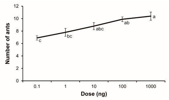 The alarm sensitivity of S. invicta workers to 2-ethyl-3,5-dimethylpyrazine was determined with the same method as described in previous reports [18,24]. We used the number of ants showing aggressive behaviors such as rapid, undirected running as a measure of alarm responses [18]. Briefly, 0.1 g of workers (approximately 100–150) were added to a plastic cup (9 cm tall × 14 cm i.d.) with the inside wall coated with Fluon to prevent escape. A 1-cm3 sugar-agar block (10% sugar water + 1% solidified agar) and a water tube were provided in the cup to allow ant feeding. A filter paper strip (1 × 3 cm) folded into a triangle was put in an empty space in the bottom of the cup. Further 10 × dilutions of 0.01 µg/µL solution of 2-ethyl-3,5-dimethylpyrazine were made to prepare 0.01, 0.1, and 1 ng/µL solutions. While ants were settled down in a quiescent group, 10 µL of sample solutions were gently loaded onto the filter paper strip. The number of workers that were running out of the group and/or displaying disoriented alarm behaviors within 2 min was recorded. Workers of a test cup were then given 30 min to recover prior to the next test. A new filter paper strip was used for each test. Alarm tests were conducted with the solvent control first and in order from low to high doses (0.1, 1, 10, 100, and 1000 ng). The experiment was replicated 10 times with ants from 10 different colonies.