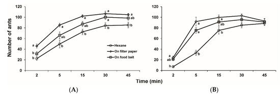 Attractiveness of 2-ethyl-3,5-dimethylpyrazine-treated hotdog baits to Solenopsis invicta workers. (A) 1 ng; (B) 100 ng. Means within the same time period with different letters are significantly different at p < 0.05, ANOVA followed by the Tukey-HSD test, and no letters indicate no differences between treatments.