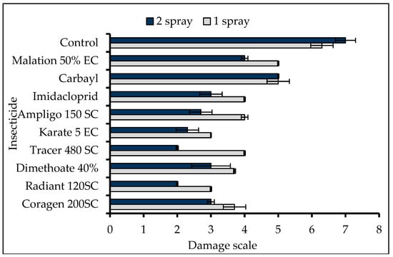 Data collected: Seven days after each of the synthetic insecticide applications, the numbers of live larvae, dead larvae, and pupae were counted in the treated plants and untreated control plants. It was not possible to recover all insects from the infested plants. Similarly, the FAW damage severity was recorded on an individual plant basis at seven-day intervals based on a rating scale described by Davis et al. [] and Williams et al. []; 0 = no visible leaf damage, 1 = only pin-hole damage to the leaves, 2 = pin-hole and shot-hole damage to leaves, 3 = small elongated lesions (5–10 mm) on 1–3 leaves, 4 = midsized lesions (10–30 mm) on 4–7 leaves, 5 = large elongated lesions (>30 mm) or small portions eaten on 3–5 leaves, 6 = elongated lesions (>30 mm) and large portions eaten on 3–5 leaves, 7 = elongated lesions (>30 cm) and 50% of leaf eaten, 8 = elongated lesions (30 cm) and large portions eaten on 70% of leaves, 9 = most leaves have long lesions and complete defoliation is observed. Plant height, stem thickness, leaf number, fresh weight, and dry weight were recorded 70 days after planting. The dry weight was obtained after oven-drying the plant stems and leaves for 48 h at 70 °C.