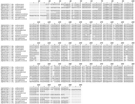 Sequence alignment of the 12S rRNA of A. ochraceus with the most related species (Only variable sites are shown. Dots represent the bases identical to those of the first sequences, and dashes indicate gaps).