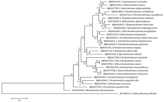 - Ohkuma, M.; Yuzawa, H.; Amornsak, W.; Sornnuwat, Y.; Takematsu, Y.; Yamada, A.; Vongkaluang, C.; Sarnthoy, O.; Kirtibutr, N.; Noparatnaraporn, N.; et al. Molecular phylogeny of Asian termites (Isoptera) of the families Termitidae and Rhinotermitidae based on mitochondrial COII sequences. Mol. Phylogenet. Evol. 2004, 31, 701–710. [Google Scholar] [CrossRef] [PubMed]