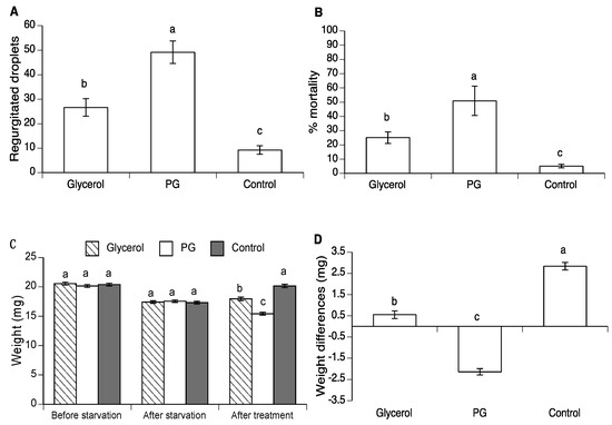 The relationship between the physiological effects of PG and glycerol and insect mortality have not been studied previously. Although both glycerol and PG are considered to be safe for humans [20,35,36], the reported effects of PG toxicity in humans include hyperosmolarity, lactic acidosis, and acute kidney injury [37] and a high intake of glycerol can produce similar symptoms in rats [16,38]. The osmotic properties of polyols may therefore impact the internal osmotic conditions of insects so rapidly and to such a degree that it is physiologically impossible to compensate for their effects, resulting in death.