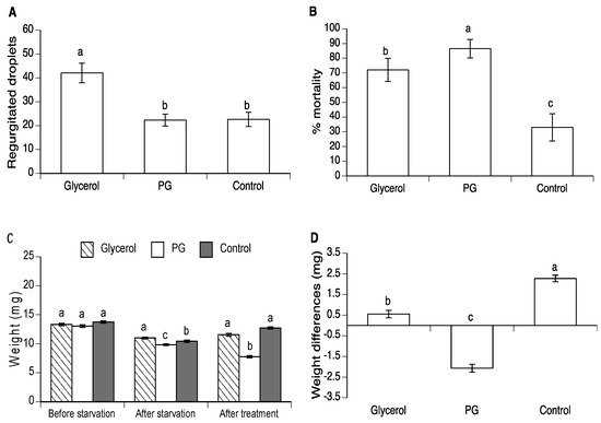 (A) Mean (± SE) number of regurgitated droplets deposited on cup walls by A. ludens exposed to 4.18 M PG or 4.18 M glycerol in mixtures with sucrose. (B) Percentage of mortality observed at 72 h post-treatment. (C) Mean (± SE) body weight of flies before starvation, prior to treatment (after starvation), and after treatment. (D) Mean (± SE) difference in body weight at 24 h after treatment. Columns headed by the same letter are not significantly different (GLM post-hoc contrasts, at the p = 0.05 level).