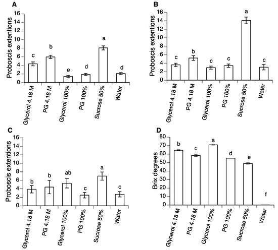 Mean (± SE) number of proboscis extension responses observed by adults of (A) A. ludens, (B) A. obliqua, and (C) D. suzukii following five exposures to 4.18 M or 100% PG or glycerol. (D) Refractivity readings (Brix) of 4.18 M or 100% PG or glycerol. Columns headed by identical letters are not significantly different (contrast for GLM, or Tukey test for ANOVA at p > 0.05).