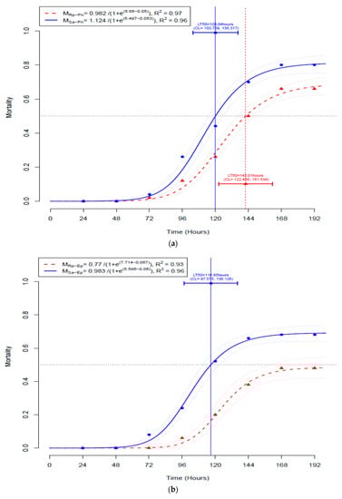 P. neoaphidis were 5.0 days (CL = 4.3, 5.7) and 5.9 days (CL = 5.1, 6.7), respectively. The estimated LT