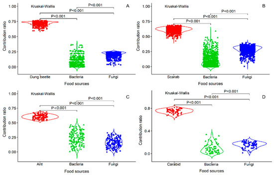 The bodies of four insects and microorganisms (fungi and bacteria) growing on insect bodies are the three types of food sources. Comparing each of the weighted averages of the number of combinations with the δm, the comparative values for which the mass balance tolerances are between −0.1‰ and 0.1‰ are retained. For the contribution ratio in the figure, each dot represents the comparative values of the acceptable solution for the feeding proportion by E. proxima. Kruskal-Wallis explanatory values are statistically significant at p < 0.001.