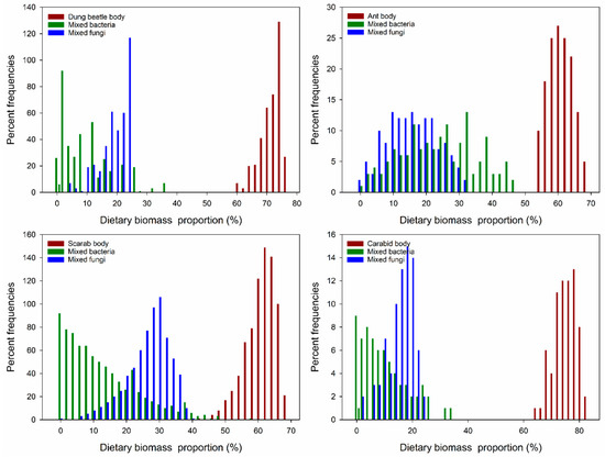 Four fungi (Rhizopus sp., Alternaria sp., Penicillium sp., and Aspergillus sp.) and two bacteria (Bacillus sp1. and Bacillus sp2.) grew on the insect body pieces during the decomposition process. The results of the analysis are listed in Table 1 as the data for calculating the acceptable solutions of food source contributions. By analyzing the food sources and Collembola after feeding, carcasses (insect body: Dung beetle, ant, scarab, and carabid) accounted for the large parts of food and ranged from 60–76%, 54–68%, 42–68%, and 64–82%, respectively. The isotopic values verified that the ratio of the four insect foods was higher than the ratios of the fungi and bacteria, especially for the carabids (p < 0.001, Figure 1A–D). In addition, by comparing the Collembola consumption ratios of the fungi and bacteria, more fungi than bacteria were consumed (p < 0.001, Figure 1A,B,D), except for the fungi growing on ants (p < 0.001, Figure 1C). These results indicate that E. proxima prefers to consume an insect body over microorganisms growing on an insect. The order of food selection was insect body, followed by fungi and then bacteria. For the mean percent frequencies of dietary biomass proportions, most of the carcasses accounted for a higher proportion than the microorganism carcasses, except for carabids. For the microorganism diet, Collembola consumed fungi more frequently (Figure 2).