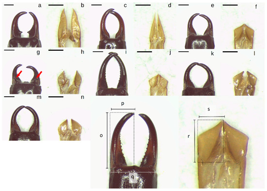 (a–n): Photos of male Anisolabididae forceps and parameres. (a,b): Anisolabis sp. 1. (c,d): Anisolabis sp. 2. (e,f): Gonolabis forcipata Burr. (g,h): Gonolabis nr. gilesi Steinmann. (i,j): Gonolabis sp. 1. (k,l): Gonolabis sp. 2. (m,n): Gonolabis sp. 3. (o–s): Diagrams of morphometric measurements taken. (o): Forceps length. (p): forceps width. (q): basal width of forceps. (r): paramere length. (s): paramere width. All scale bars indicate 1 mm. Red arrows indicate location of dorsoventrally oriented teeth on forceps of male G. nr. gilesi.
