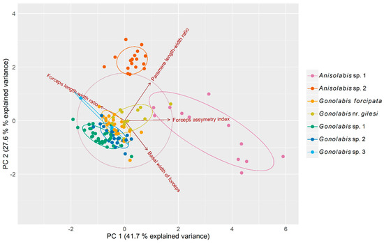 Biplot of principal component analysis measuring variation among male Anisolabididae specimens for seven morphometric variables related to primary and secondary male sex characteristics. Ellipses represent 68% normally distributed confidence intervals for the principal components plotted to aid visualisation of clusters. Vectors with arrows represent loadings of the variables on the principal components. Their direction relative to the x- and y-axes and each other represents their correlations with each principal component and each other. Orthogonal vectors are not correlated and vectors in opposing directions are negatively correlated. The length of the vectors in relation to the correlation circle is a relative indicator of the quality of each variable’s representation in the biplot.