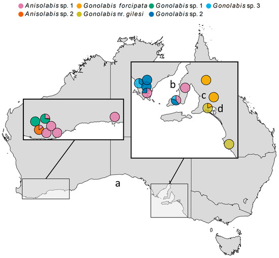Map of Australia showing locations of collection of Anisolabididae specimens, with pie charts indicating the proportion of each morphospecies found at each site. Some pies have been nudged slightly from their original position to prevent overlapping. Left-inset: Western Australia (WA) sites. Right-inset: South Australia (SA) sites. (a) Great Australian Bight. (b) Spencer Gulf. (c) Adelaide. (d) Lake Alexandria.