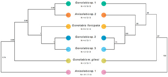 Regardless, the generic assignments following Steinmann [6] are paraphyletic and polyphyletic for Gonolabis and Anisolabis respectively according to the molecular phylogeny. The log-likelihoods of the best-known ML trees unconstrained and constrained by the monophylies of Gonolabis and Anisolabis were −8205.895 and −8216.307, respectively. The Shimodairo-Hasegawa test did not indicate that the constrained tree was significantly worse (p > 0.05), although plotting it did reveal that the constraint caused many of the branches to reduce to almost zero. This would raise the constrained tree’s log-likelihood considerably [71], so the result of this test may be unreliable. Gonolabis forcipata, G. sp. 2 and G. sp. 3 form a highly supported clade (Figure 4) and they also show considerable morphometric overlap (Figure 2). All other individual morphospecies form their own clades. Each of the clades proposed by *BEAST is distinguished by distinct forceps morphology (c.f. Figure 1 and Figure 4). Moreover, there appear to be two state-specific clades, the SA clade and that formed by G. sp. 1 and A. sp. 2 (c.f. Figure 3 and Figure 4) (referred to henceforth as the WA clade).