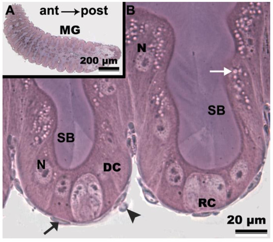 Light micrographs of the midgut of Friesella schrottkyi worker. (A) Overview of the midgut (MG). Arrow—antero-posterior orientation. (B) Epithelium showing columnar digestive cells (DC) with well-developed nuclei (N), apical striated borders (SB) and cytoplasm vacuoles (white arrow). Note regenerative cells nests (RC). Black arrow—nucleus of circular muscle. Arrowhead—nucleus of longitudinal muscle.