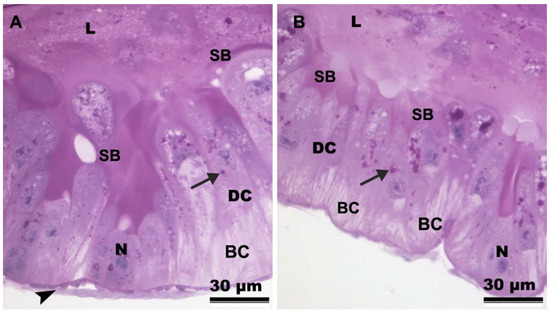 Light micrographs of the midgut of Friesella schrottkyi worker submitted to P.A.S histochemical test. (A) Anterior midgut region showing digestive cells (DC) with positive granules (arrow) in the median-apical cytoplasm and weak reaction in the basal cytoplasm (BC). Note that striated border (SB) has positive reaction. (B) Posterior midgut region showing digestive cells (DC) with positive granules (arrow) in the median-apical cytoplasm and weak reaction in the basal cytoplasm (BC). Arrowhead—muscle, L—midgut lumen, N—nucleus of the digestive cell.