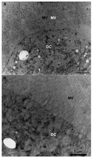 Our findings show that F. schrottkyi with its small body size (3 mm) has long microvilli (23.51 μm) in the digestive cells. However, larger bees such as B. morio (15.6 mm) and T. spinipes (7 mm) [41] present 8 μm and 2.5 μm long microvilli, respectively [11,27]. Since the size of some organs such as the alimentary canal [39] and ovaries [42] are proportional to the body size of bees, we suggest that the length of microvilli in the digestive cells of F. schrottkyi are longer than those of bees with a larger body size to compensate for the small size of its midgut.