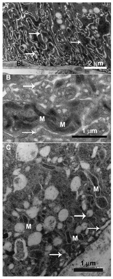 Transmission electron micrographs of digestive cell in the midgut of Friesella schrottkyi worker. (A) Basal region of the digestive cell in the anterior midgut region showing many plasma membrane infoldings forming extracellular channels (arrows). BL—basal lamina. (B) Details of extracellular channels (arrows) associated with mitochondria (M). (C) Basal region of the digestive cell in the posterior midgut region showing extracellular channels (arrows) associated with mitochondria (M).