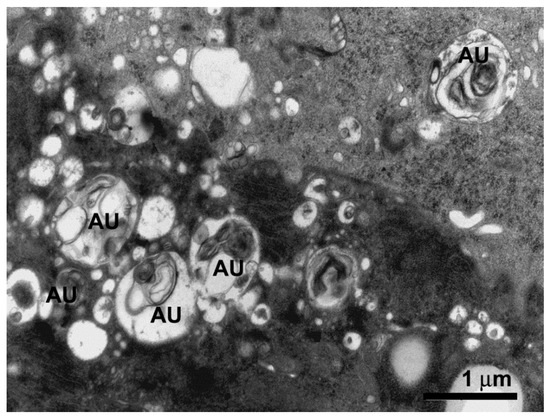 Transmission electron micrograph of median region of the digestive cell in the midgut of Friesella schrottkyi worker showing cytoplasm with many autophagosomes (AU) filled with membrane debris.