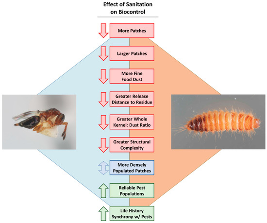 In this situation, a higher density of pests in each patch may make control of pests unrealistic if parasitoids are constrained by the number of eggs they carry, thereby further decreasing the efficacy of biological control. By contrast, an environment with a handful of small patches of low pest density, and less food dust compared to whole seed kernels may result in enhanced efficacy of parasitoids against stored product insects (Figure 2). This may be due to increased searching efficiency and pest encounter rates. These scenarios present testable hypotheses that are worth following up in future research on evaluating the effect of sanitation on biological control efficacy.