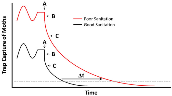Predicted trap capture of a hypothetical stored product moth population under relatively poorer (red) and better (black) sanitation program. A—implementation of mating disruption program, B—immediate decrease in trap efficiency as a result of stimulus competition (not biologically indicative of decreasing infestation), and C—increasing efficacy of mating disruption over time. The main difference between good and poor sanitation programs is the time (Δt) with which moths decrease below some pre-determined action threshold (dashed grey line).