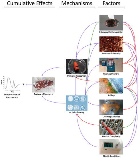 Other pest management tactics used in a facility may also influence the interpretability of baited trap captures above and beyond the effects of sanitation alone (Figure 4). Indeed, Toews et al. [95] found that the use of crack and crevice applications in pilot scale warehouses translated to decreased captures in traps. This may suggest to an IPM practitioner that their tactic is succeeding in reducing populations, however direct sampling in that study revealed that populations in beta-cyfluthrin-treated warehouses were increasing at a similar pace to untreated warehouses.