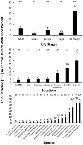 The fold decrease in control efficacy in the presence of food compared to controls with no or less food for different life stages (top panel) of stored product insects, assessed in different locations (middle panel), for a variety of target species (bottom panel). Numbers located above bars represent the number of independent observations from experiments in the literature. Bars with shared letters are not significantly different from each other (Tukey HSD, α = 0.05). Factors with fewer than n = 3 observations were excluded from graphs and analysis.