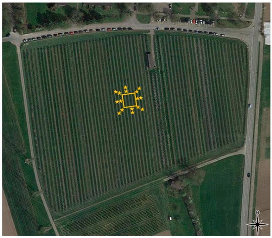 Site 1 with release plot (golden square) for releases 2016–2018, position of H. halys egg masses outside of release plot in 2016. Changed after Reference [31].