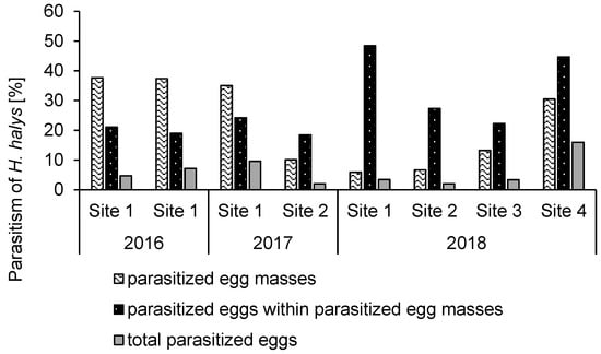 When data from all releases were combined, total egg parasitism was on average 6%. Based on the mean host exploitation value in the field (6.70 eggs), only 1% of the 540 released females would have been responsible for the observed parasitism if each of the egg masses was found by only one female. This could also be connected to the small experimental plots, where dispersal is more likely than from bigger areas such as a whole orchard. Calculations carried out by Reference [38] after releases of Trichogramma nubilale Ertle and Davis (Hymenoptera: Trichogrammatidae) revealed that every day 40% of the parasitoid females disappeared, which was attributed to the hot and dry weather conditions. In the present study, weather conditions at release sites were extremely hot and dry over the three years of the study and may have caused some degree of adult mortality. Another factor that might have influenced observed parasitism levels is intraguild predation. Some sentinel eggs that showed signs of predation also had A. bifasciatus host feeding marks, indicating that at least some parasitized eggs had been eaten by predators. As interactions between parasitoids and predators of H. halys have not been studied so far [28], future studies on the subject could provide valuable input.