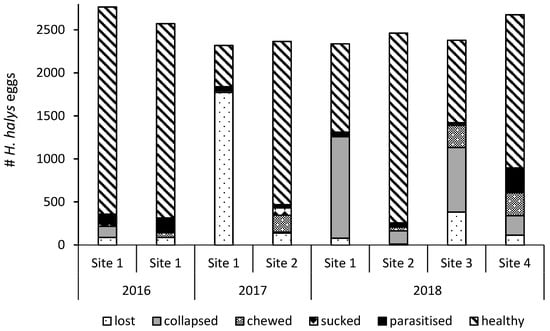 Recollected eggs were stored individually in small 54 × 14 mm Petri dishes at 26 °C, 70% RH, and a 16L:8D photoperiod. Eggs were counted and assigned to one of the following categories: collapsed, chewed, sucked (see Reference [32]) or intact eggs. Collapsed eggs were defined as eggs that looked undamaged but had lost more than half of their volume.