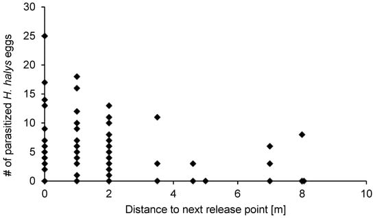 Number of H. halys eggs parasitized by A. bifasciatus depending on the distance to the closest release point during the first two releases in 2016 (site 1).