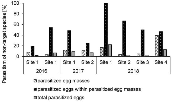 Natural parasitism of sentinel egg masses prior to releases was overall low (site 2) or absent, with the exception of site 4 (Carpi), where it reached 28% (7 out of 25 egg masses). At site 1 (Lindau), parasitoids had been released in 2016, but no parasitism was detected in eggs exposed prior to releases in 2017.