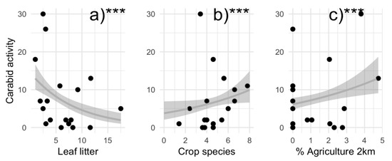 Local and landscape drivers of carabid activity density in urban gardens in the California central coast as determined with generalized linear models. Carabid activity responded to leaf litter (a), crop species richness (b), and agriculture land cover within 2 km surrounding gardens (c).