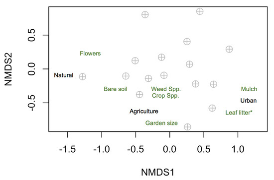 Non-metric multidimensional scaling plot showing carabid community composition in the sixteen gardens where beetles were collected in relation to local and landscape factors. The asterisk (*) indicates the one significant factor.