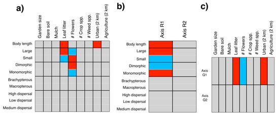 Biplot of fourth corner analysis (a) of carabid traits in relation to local and landscape factors. In (b) and (c), biplot of RLQ analysis of the relationship between the carabid trait axis (Q) in relation to the local and landscape factors axis (R). Red indicates positive and blue indicates negative correlations between factors.