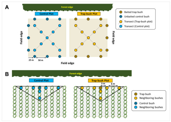 Additional fruit samples were taken to determine if aggregation of injury in trap bushes results in lower fruit injury in the interiors of trap-bush plots compared with the interiors of control plots. For this, approx. 360 berries were sampled from nine interior bushes (Figure 1A) in the trap-bush and control plots. Therefore, a combined total of ~5760 berries was taken from trap-bush and control plots (40 berries × 18 bushes × 4 plots) for each of the two sampling dates and the two years.