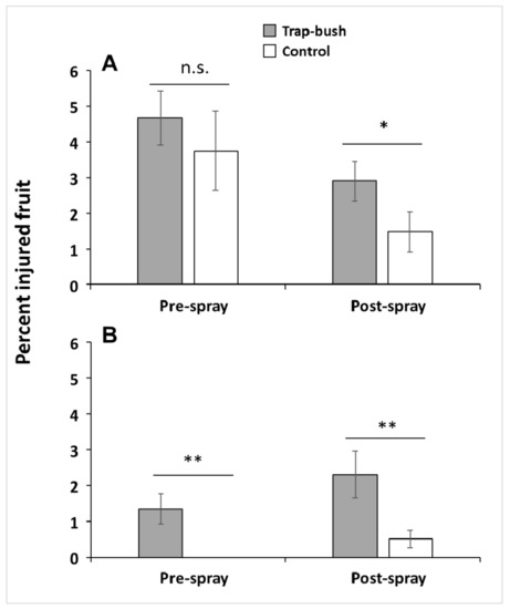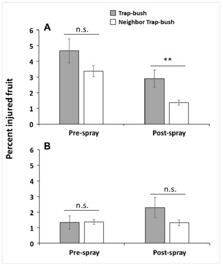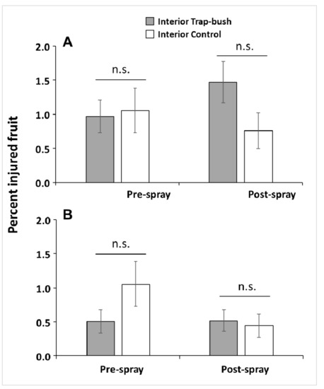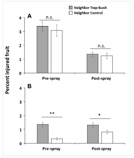 We collected fruit samples to address: (1) whether trap bushes result in significant aggregation of fruit injury in the specific trap bushes compared with control bushes, (2) whether fruit injury is greater in bushes neighboring trap bushes compared with control bushes (i.e., spillover effect), and (3) whether injury in plot interiors differs between trap-bush and control plots. For #s 1 and 2, the total number of fruit with oviposition scars was recorded from a sample of six random clusters per bush ( ~40 berries per bush) from odor-baited trap bushes in the trap-bush plots and from unbaited bushes in the control plots, and from six peripherally located trees surrounding each trap bush and control bush (Figure 1B), for a total of approximately 2500 fruit per plot. Three of the sampled peripheral bushes were next to the trap bush (“near” neighbors; i.e., 1.5–3 m away from the trap bush), while the other three were two bush-lenghts away (“far” neighbors; i.e., 4-6 m away from the trap bush) (Figure 1B). In both years, fruit samples were taken in two dates: the 1st (pre-spray) samples were taken at early fruit set and before any insecticide application; the 2nd (post-spray) samples were taken 10–14 days later and after a post-bloom insecticide application of phosmet (Imidan®; Gowan Co., Yuma, AZ, USA). In 2013, fruit injury evaluations were made on 21–23 May (pre-spray samples) and on 4–6 June (post-spray samples); while in 2014, fruit injury evaluations were made on 23–27 May (pre-spray samples) and on 3–6 June (post-spray samples). Prior to bloom, all plots were treated with novaluron (Rimon®) on 17–18 April. All plots were also treated with phosmet post-bloom on 28–30 May, after honeybee hives had been removed from the fields. Phosmet has both curative, i.e., reduces larval emergence rates, and adulticidal activity, while novaluron has anti-ovipositional/ovicidal activity [27,28]. Timing of the post-bloom insecticide application was based on injury data obtained from fruit samples across both plots within farms.