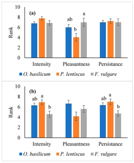 Essential oils (EOs) and EOs-aromatized wheat sensorial description. Sensorial descriptors were ranked by panel components on a 0 to 10 scale. Histograms represent the mean of the ranks. (a) sensorial descriptors of the EO of Foeniculum vulgare, Ocimum basilicum, and Pistacia lentiscus; (b) sensorial descriptors of the EOs-aromatized wheat. Data represent the mean values of the smell ranks as assessed by the panelists. Bars represent the standard error. Different letters indicate significant difference among the treatments according to Tukey’s b post-hoc test (p < 0.05).