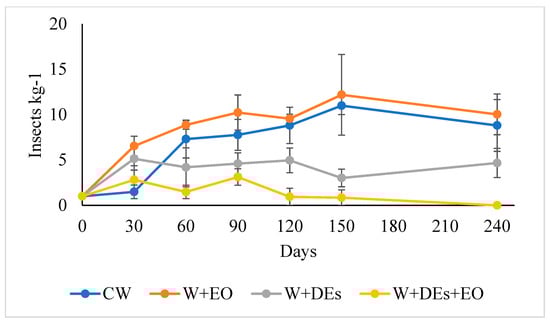 Temporal evolution of the beetles infestation of the stored in the mini-silos during the trial (240 day). CW, control wheat; W + EO, wheat treated with the essential oil of Ocimum basilicum; W + DEs, wheat treated with diatomaceous earths; W + Des + OE, wheat treated with O. basilicum essential oil and diatomaceous earths. Data represent the mean number of adults kg−1 of grain. Bars represent the standard error.