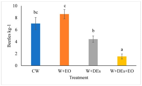 Average beetle infestation of the wheat stored in the mini-silos. CW, control wheat; W+EO, wheat treated with the essential oil of Ocimum basilicum; W + DEs, wheat treated with diatomaceous earths; W + DEs + OE, wheat treated with O. basilicum essential oil and diatomaceous earths. Data represent the mean number of adults kg−1 of grain. Bars represent the standard error. Different letters indicate significant differences among the treatments according to Tukey’s b post-hoc test (p < 0.05).
