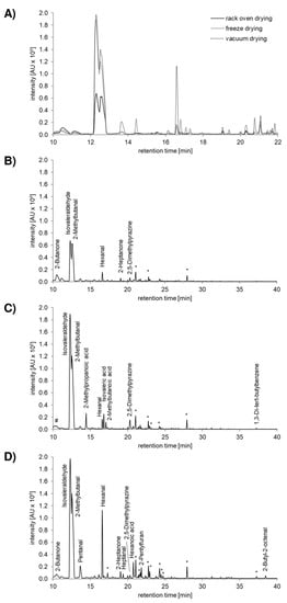 Headspace gas chromatographicanalysis of dried Tenebrio molitor larvae. Representative GC-chromatograms out of three independent head space GC−MS experiments are shown in overview (A) and in detail for rack oven drying (B), freeze drying (C) and vacuum drying (D). * alkanes < 0.002% w/w, # mixed peak of 2-butanon and diacetyl.