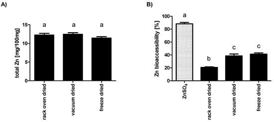 Figure 2A shows the absolute zinc content for Tenebrio molitor larvae. Overall the levels were almost comparable between the differently dried mealworm samples. The estimated values of around 12 mg/100 g weight is very similar to the concentrations previously reported for crude mealworm larvae [21,23,41], suggesting no significant loss of the trace element in the course of drying.