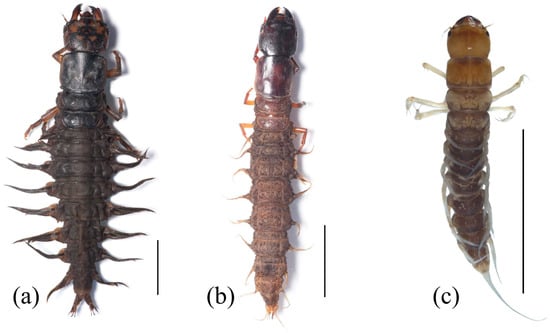 Habitus of Megaloptera larvae. (a) Corydalus liui Ardila-Camacho & Contreras-Ramos, 2018, (b) Chloronia sp., (c) Ilyobius sp. Scale = 10 mm. Images by Adrian Ardila-Camacho.