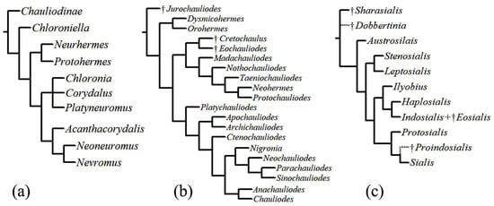 Phylogenetic trees. (a) phylogeny of Corydalinae proposed by Contreras-Ramos [], (b) phylogeny of Chauliodinae proposed by Liu et al. [], (c) phylogeny of Sialidae by Liu et al. [] (putative positions indicated by dotted lines).