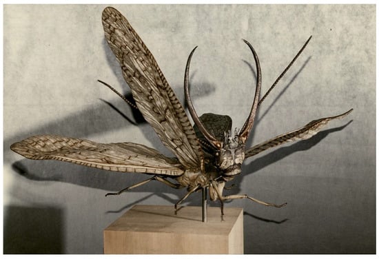 Larval Megaloptera represent an important component of aquatic food webs [] and constitute part of the diet of an important variety of organisms, including vertebrates and other invertebrates. Odonata naiads and predatory Trichoptera have been reported among the aquatic invertebrate enemies of Megaloptera, yet many other groups such as aquatic Coleoptera and Hemiptera may also prey on megalopteran larvae. Predatory fishes are probably the principal natural enemies of this group []. In South America, some species of the rodent Ichtyomys prey on mature larvae of Corydalus and Chloronia, and in Mexico pigs forage on Corydalus larvae [,]. In Mexico and other regions of Latin America, hellgrammites, particularly of the genus Corydalus, are used as food by human communities, and in North America are appreciated as fishing bait []; Acanthacorydalis larvae are used in traditional food and medicine in southwestern China [], and dehydrated Protohermes larvae are used as infant tranquilizer in Japan []. Energy flow from the aquatic towards the terrestrial environment, based on considerable figures of secondary production by megalopteran larvae [,], is another understudied service of this biological group in neighboring freshwater and terrestrial ecosystems. At least one artist (Adam Pasamanick) has built a realistic bronze sculpture of a male Corydalus cornutus, now exhibited at the Fairbanks Museum and Planetarium in Vermont (Figure 4).